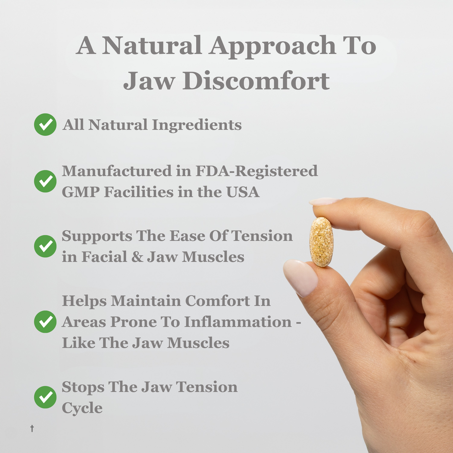 This unique blend of ingredients offers a natural approach for those experiencing patterns of clenching, stress, and tension around the jaw. Regular use supports muscle relaxation, reduces stress-related tension, and promotes long-term jaw comfort — all without the risks of NSAIDs or prescription medications.†